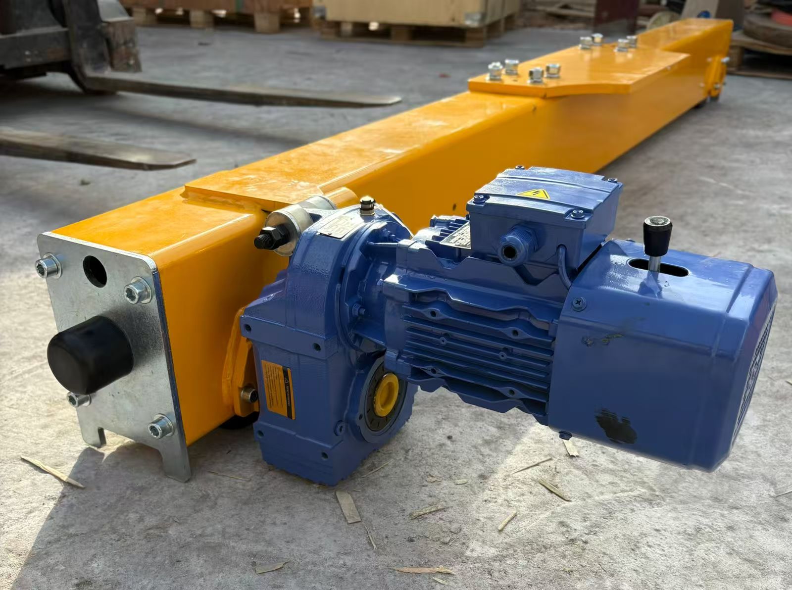 “Geared motor: Modern cranes often use a “three-in-one” drive unit that integrates a motor, brake, and reducer.